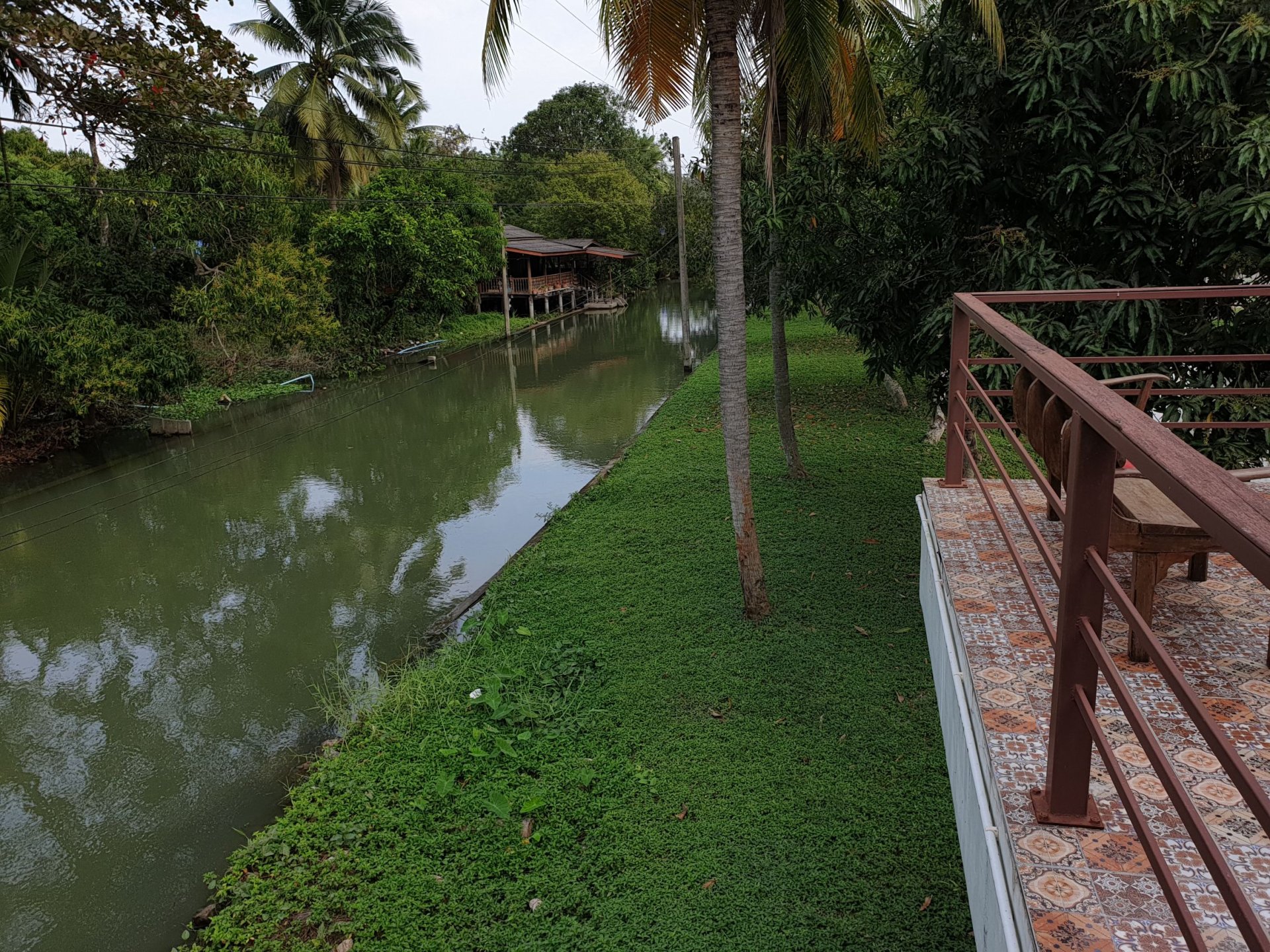 ช่วงนี้น้ำขึ้น น้ำเค็มรุกมาถึง แต่ตลิ่งที่ปลูกพืชคลุมด้วยถั่วบราซิลก็ยังเขียวสวยและรักษาหน้าดินให้สวยงามแม้ใต้ร่มมะม่วงมะพร้าวทั้งหลายไปจนจรดริมฝั่งน้ำได้อย่างสบายๆ